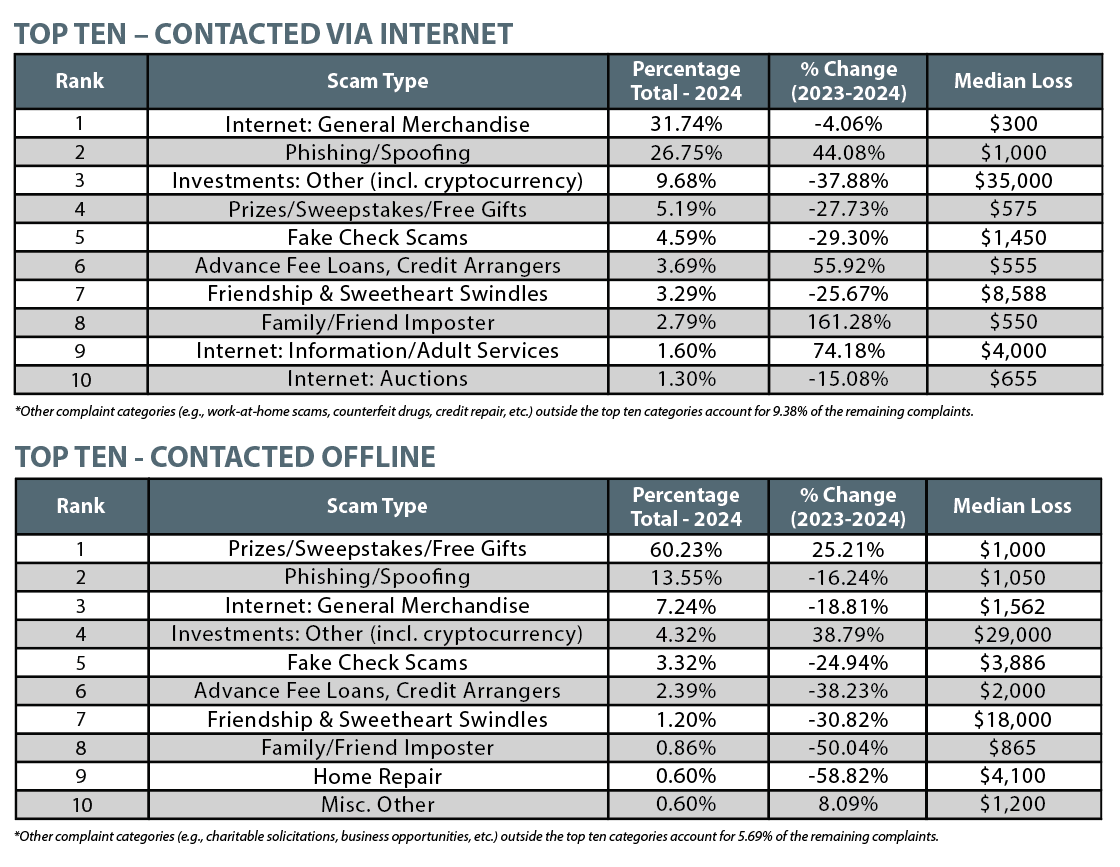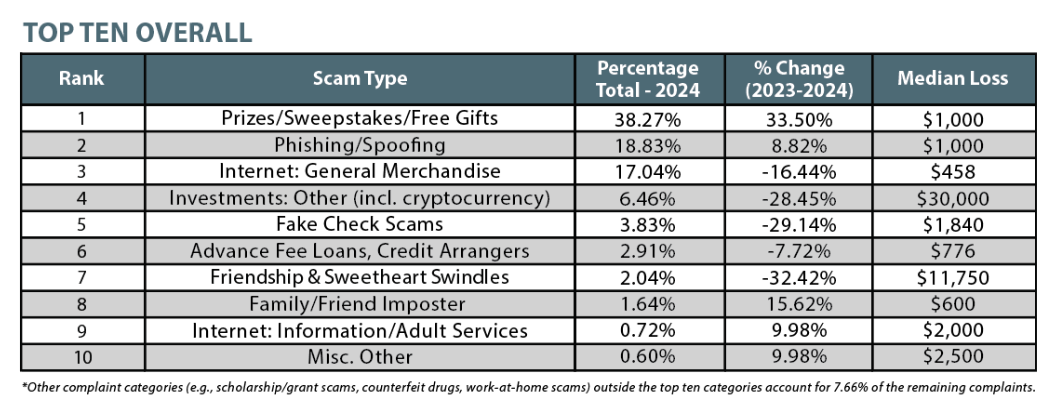 When criminals find a scam that works, they tend to stick with it. That was the case in 2024, when complaints involving fake sweepstakes and bogus gift offers were again the top scam category, making up over a third of all fraud reports (38.27%). Criminals running sweepstakes scams overwhelmingly relied on the telephone to reach potential victims, with 87% of reports indicating that a phone call was how the scam began. Phishing/spoofing scams (18.83% of reports) and Internet merchandise scams (17.04% of reports) rounded out the top three fraud categories for the second consecutive year.